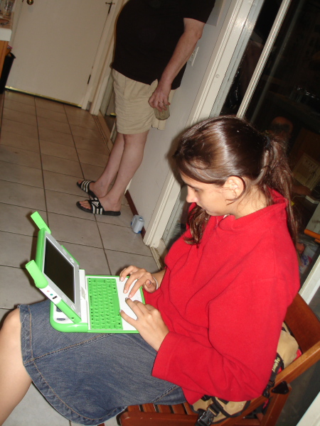| Shoshana Safir testing the One Laptop Per Child Prototype. |